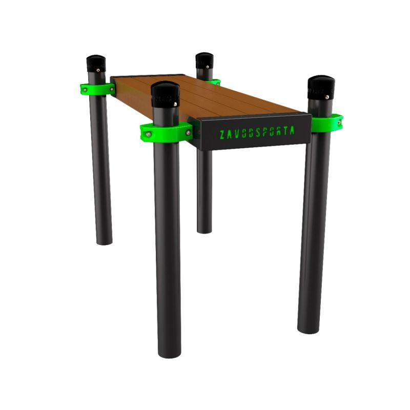 Прочная и устойчивая скамья для выполнения отжиманий, упражнений на пресс или растяжки. Основание выполнено из древесины хвойных пород, обработанной для уличной эксплуатации. Подходит как самостоятельный элемент для оснащения площадки, так и как дополнение к комплексам для повышения комфорта и функциональности тренировочной зоны.